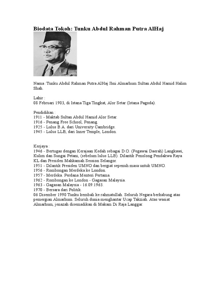 Almarhum Tunku Abdul Rahman Putra Al-Haj ibni Almarhum Sultan Abdul Hamid Shah merupakan Ketua Menteri Persekutuan Tanah Melayu dari 1955 dan Perdana Menteri Malaysia pertama sejak. Maklumat mengenai biodata tunku abdul rahman tunku abdul rahman biodata biografi tunku abdul rahman pendidikan kerjaya politik dan lain lain. Biodata Tunku Abdul Rahman UMNO May 22 2020 Tunku Abdul Rahman Putra Al-Haj diputerakan pada 8 Februari 1903 di Alor Star Kedah.