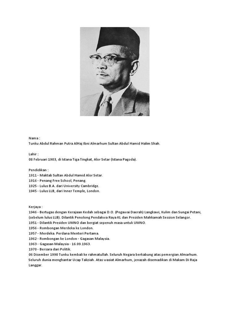 Doc Bapa Kemerdekaan Malaysia Tunku Abdul Rahman Putra Al Haj Biodata Cikgu Mor Academia Edu